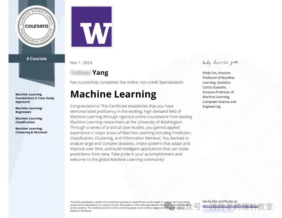 其中,成功打穿了来自华盛顿大学夫妻档教授的 Machine Learning Specialisation 的全部 Course,刷出了 Coursera Specification 证书一张,集邮爱好者心底美滋滋。